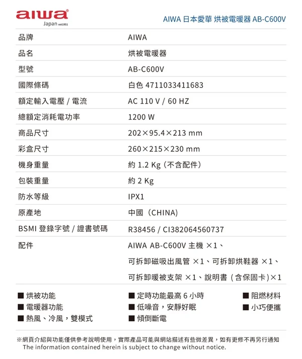 .烘被功能 .電暖器功能 .熱風、冷風,雙模式 .定時功能最高 6 小時 .低噪音,安靜好眠 .傾倒斷電 .阻燃材料 .小巧便攜